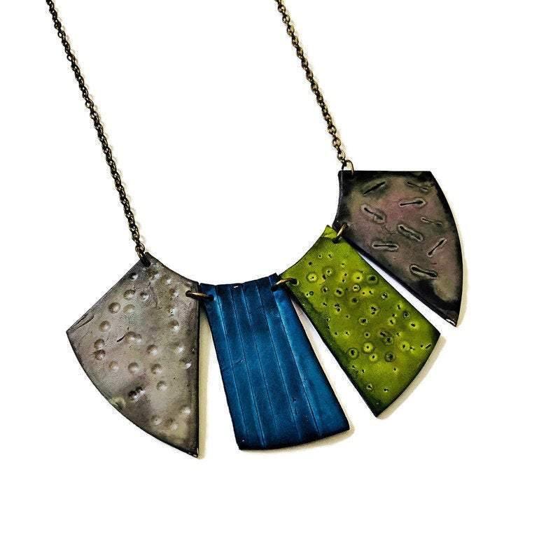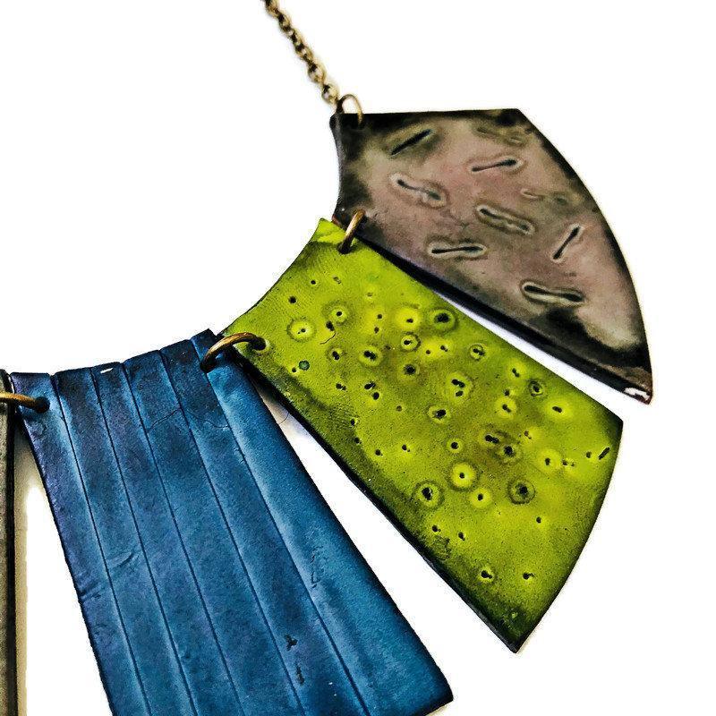 This colorful statement necklace was handmade from polymer clay and hand painted. It is bold and colorful and a true statement necklace. The bib consist of four pieces, each with it's own unique textured design. When wearing the necklace it has a fringe like style.
