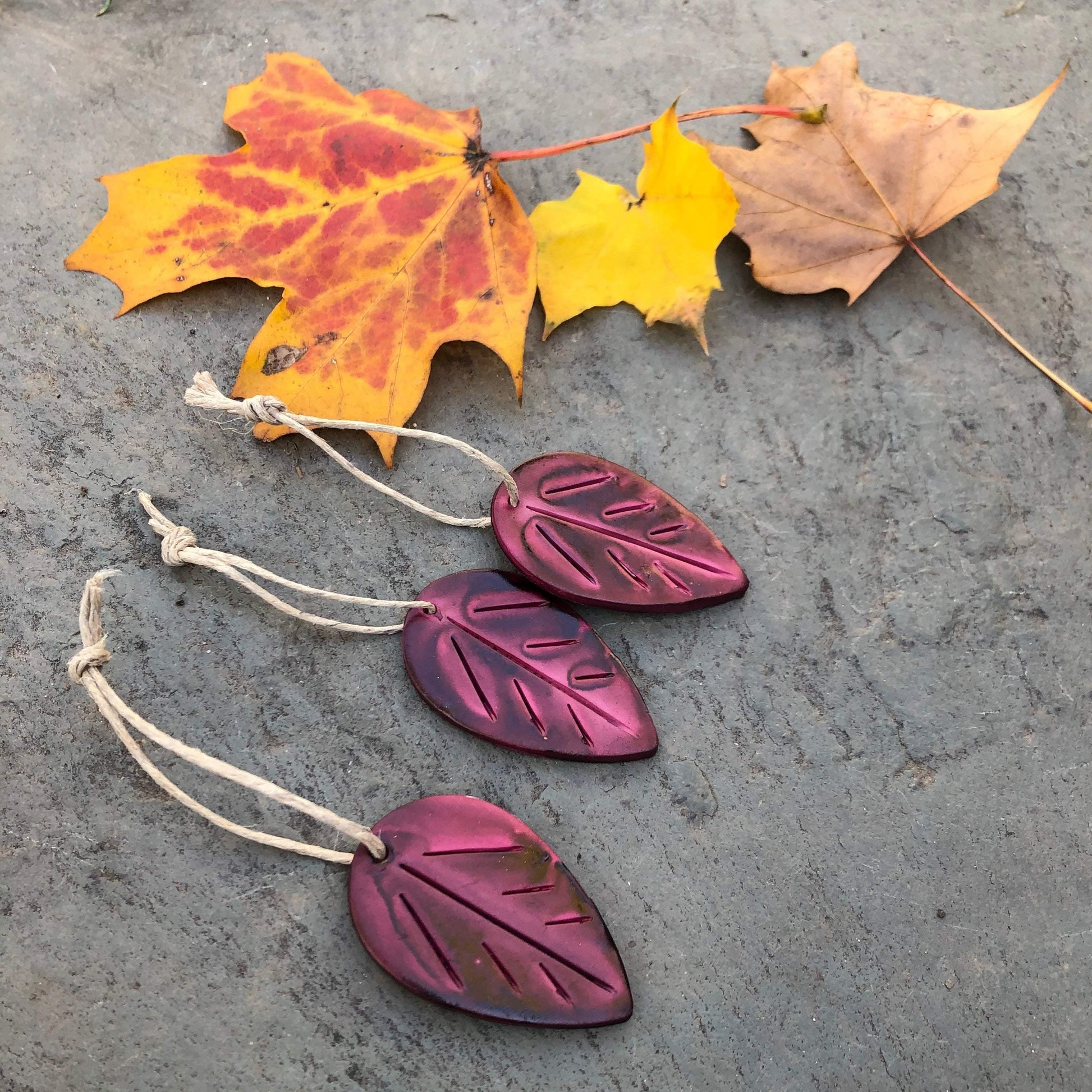 These rustic leaf ornaments were handmade from polymer clay and hand painted with alcohol ink. They have a wood like appearance and can easily be used as décor during both the fall and winter season. They are non-traditional in color making them all that more special. They come on hemp cord and are ready to place on your Christmas tree, plants or anywhere you want to add a earthy touch.